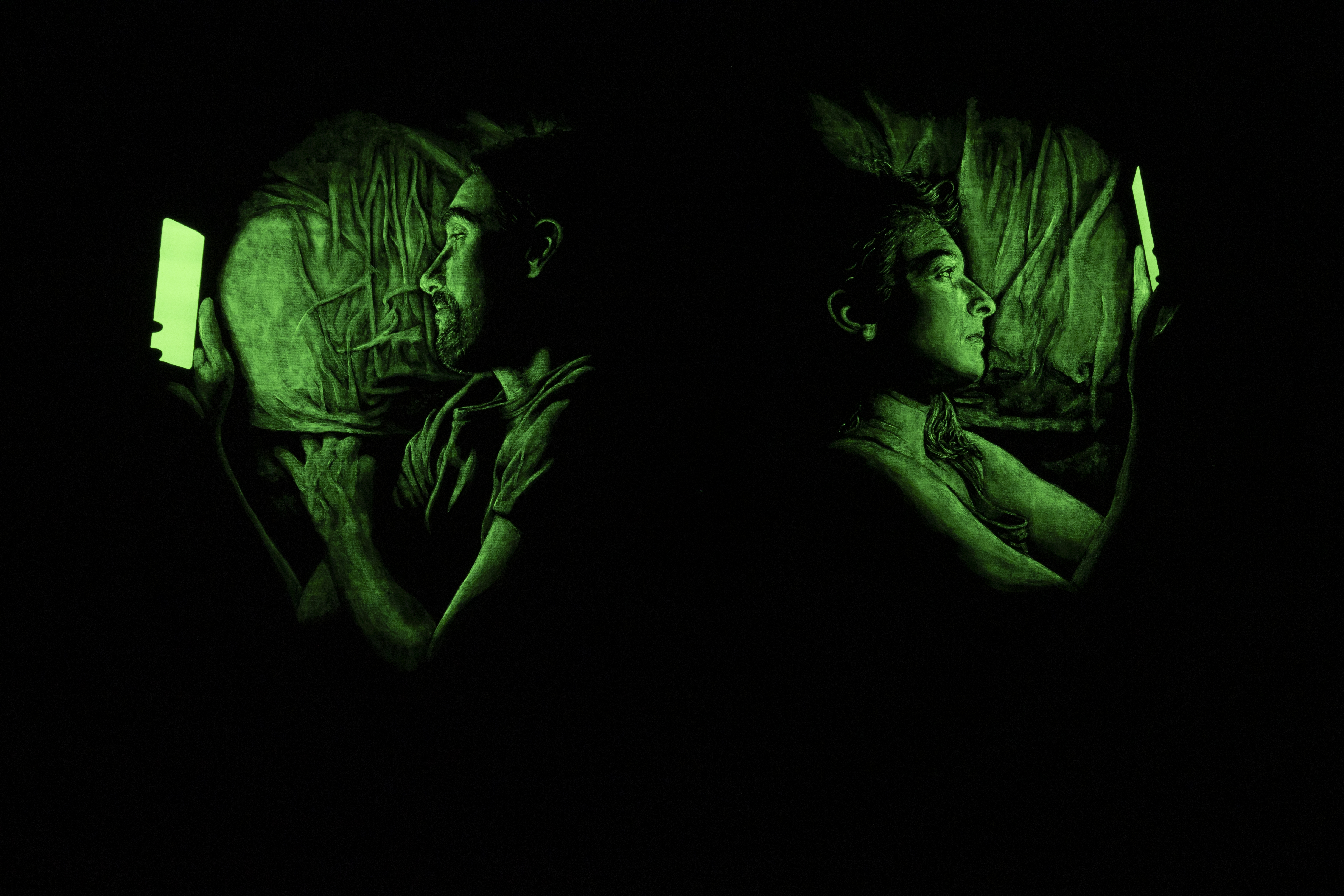 ¿Qué relación puede establecerse entre el arte y el uso de la tecnología? ¿Cómo traducir al lenguaje pictórico las construcciones de sentido que se producen alrededor del fenómeno del smartphone? ¿Cuáles son los valores éticos que rodean el uso apropiado de estas realidades tecnológicas y comunicativas? Son algunas de las preguntas sobre las cuales, en continuidad con su obra precedente sobre entornos digitales, Vidaña nos invita a reflexionar con esta nueva instalación.
